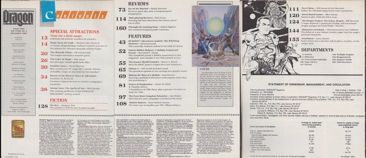 But before digging into that theme, there is an editorial looking back at the periodical’s past and co-written by three people who mostly discuss their own experience of it: Kim Mohan, Roger Moore, and Dale Donovan. Kim Mohan is the former Editor-in-Chief (he held the role when I began to get the mag), who returned to the role with the previous issue, having originally left to follow Gary Gygax on his failed post-D&D gaming ventures when the co-creator of the game was ousted in 1985. Roger Moore was the editor I was most familiar with (esp. since for a time he also ran Dungeon Magazine) and he had taken the role to replace Mohan. Dale Donovan was a relatively recent arrival and was Associate Editor. If the editorial explains why he gets to contribute I didn’t catch it in my admittedly very brisk re-read.