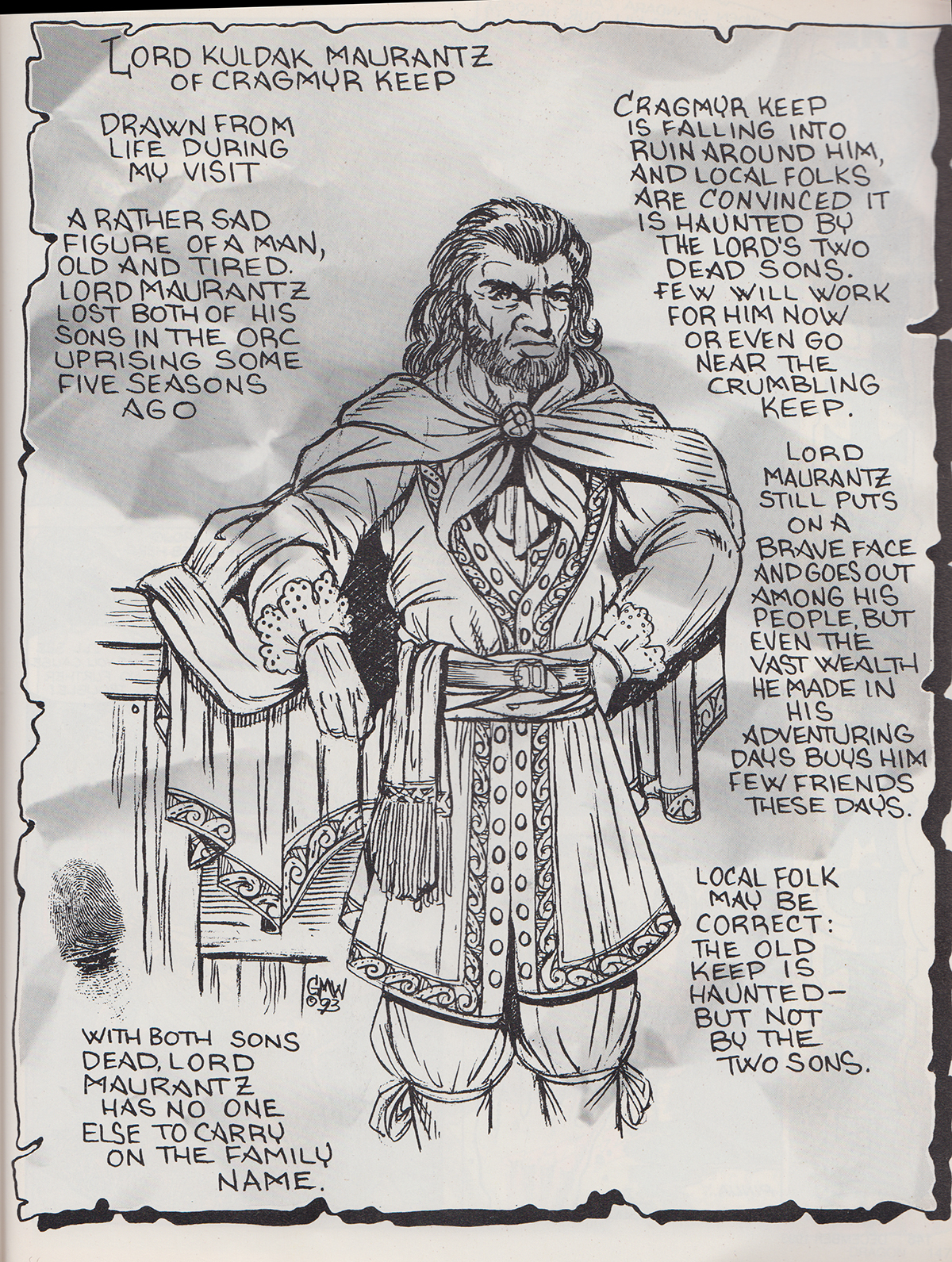 from Elminster’s Notebook. Art by Gary Williams “Elminster’s Notebook by Ed Greenwood (with art by Gary M. Williams) is evidence of how popular the Realms were in the early 1990s. This marked a new series of articles with Elminster’s point of view from his travels of Faerun. It tells the reader of Cragmyr Keep and has a splash page portrait of its lord with notes on the NPC. The Forgotten Realms was a setting about characters more than about its places, and I think there is nothing wrong with that, as long as the PCs have the feeling (if not the chance) of a chance to become as infamous as those Greenwood likes to write about. It was an approach that led to countless fantasy books of varying quality.