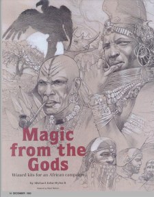 art by Mark Nelson. “Magic from the Gods” by Michael John Wybo II. This article provides some African-based wizard kits (kits were a crude form of subclass or prestige class – depending on how you looked at it – from back in the 2E days). When I get back around to issue #195, which has more African-themed kits, I’ll discuss my discomfort for even the most sensitive approaches to appropriating this material into D&D. I am not saying you cannot use a variety of African folklore and traditions to inspire things in your game, but you have to be careful to no attempt direct game interpretations of real-world peoples. This article does more of that, with kits based named for real world peoples like the Baule and the Zande. It doesn’t help that Wybo writes things like “In Africa, there can be no magic without either the will of the gods, or some other more malign power.” I find stuff like that conflating a fantasy aspect of the game D&D with a varied and real world people and its traditions around magic and religion. Are DMs meant to just put “Africa” into their homebrew worlds? Are they meant to play games set in “Africa” as if it were a fantastical place? I am not too sure either a great idea.