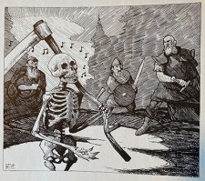 art by P. L. Wolf “The Whistling Skeleton” is a short module written by Ed Greenwood and presented in the format common to Dungeon Magazine (to the extent of having a faux-cover inserted before it. The scenario isn’t great by my estimation and spends way too much time explaining the way the titular skeleton was made by means of existing spells that as written don’t really work as described. All of this for what is essentially an ambush encounter.