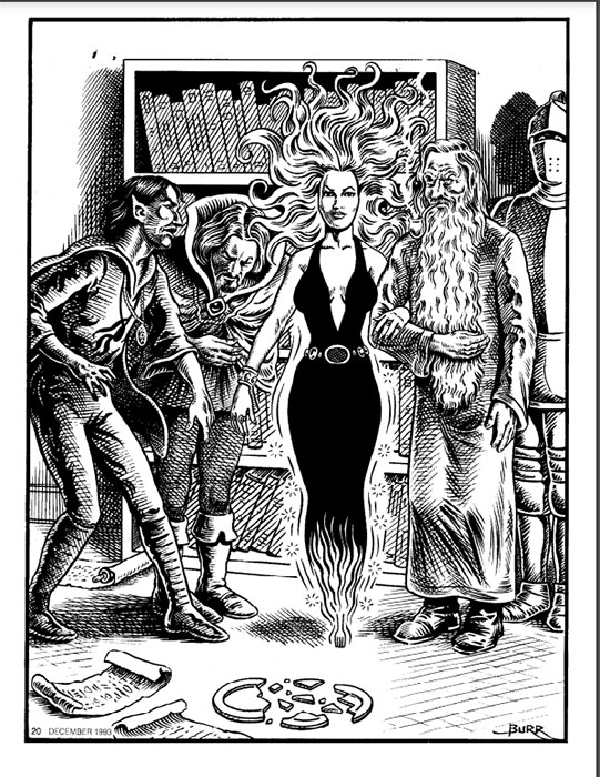 The Wizards Three are visited by the Simbul. (art by Dan Burr) “The Wizards Three” by Ed Greenwood. This is a classic feature, which had Forgotten Realms creator and frequent contributor to Dragon, Ed Greenwood writing short fiction imagining conversations between the Realms’ Elminster, Mordenkainen from Greyhawk, and Dalamar the Black, the elven wizard of the Black Robes from Dragonlance’s world of Krynn and then detailing a handful of spells of different kinds they might have traded or discussed. The conceit is that they meet here on Earth in Greenwood’s apartment as he hides in a suit of armor to take notes. One of the spells, a 9th level one called Alamanther’s Return is particularly interesting to me (allowing the wizard to replicate a spell he has seen before even if he doesn’t know it or even its name!), but at the same time, I have never run a D&D game in 40 years where the casting of 9th level spells was ever even a possibility.