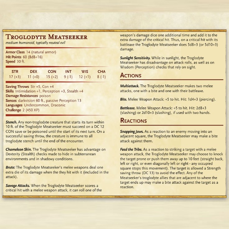 A link to a PDF version of the Troglodyte Meatseeker for download follows the lore and stat block below. (For more info on the changes to stat blocks on HOW I RUN IT see the About STAT BLOCKS page.)