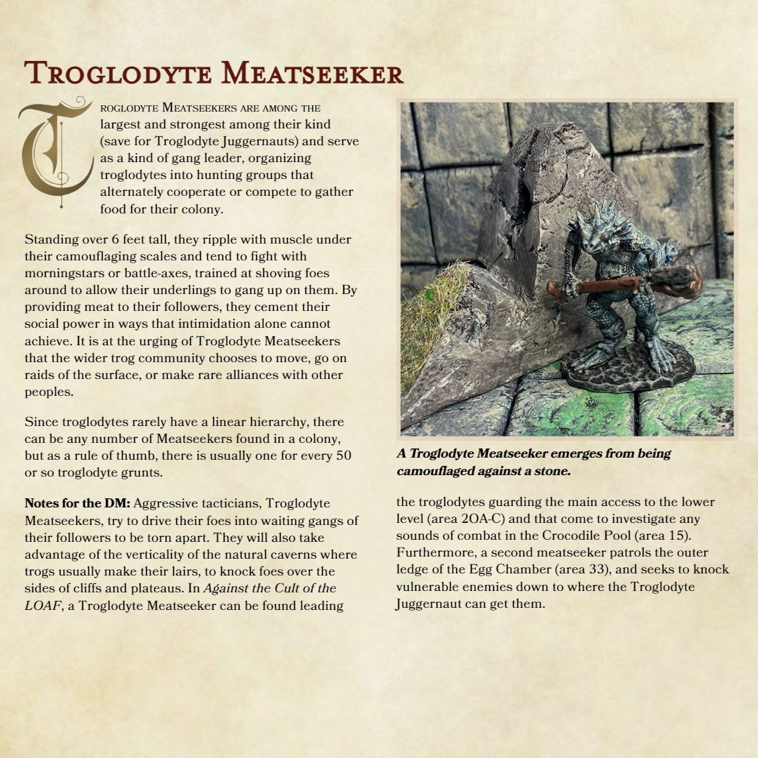When I decided that my version of N1 – Against the Cult of the Reptile God needed a greater variety of types of troglodytes, the very first thing I did was google for some options and didn’t find many. . . in fact, all I found was one called the “Troglodyte Meatseeker” on a D&D wiki that claims it comes from an EN Publishing product, but does not detail which one exactly. No other searching made this clear. So I took that version and adapted it to be my own, and then went from there creating the Troglodyte Juggernaut and all the others.