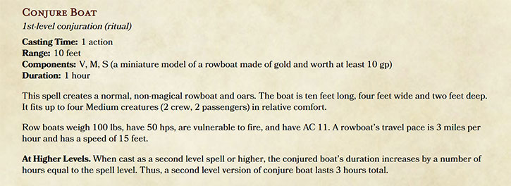 The original spell, as written, had a duration based on caster level, as spells often did in previous editions. Rather than change how spell durations work in 5E, I decided to make longer duration a result of upcasting the spell. Some folks might argue that no one would ever want to spend a 3rd or 4th level spell slot just for a normal rowboat, but I say, they might if they were desperate or under-prepared enough to have to when a just such a rowboat is needed for a few hours. And I am sure there are others that might argue that having to make such a choice is not “fun,” to which I can only respond that to some people having to make those hard choices is exactly what fun can look like, and if it doesn’t to you and your group, you are free to change the spell for your table.
