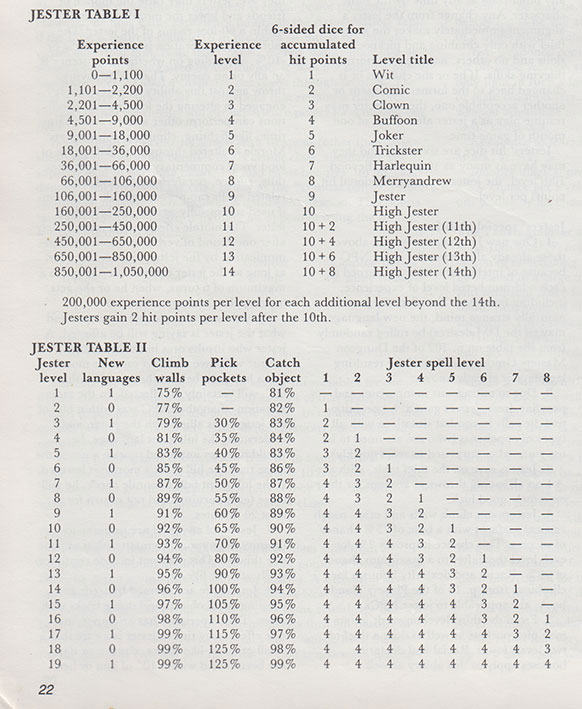 I loved the Jester and still do. I played one or two in short-lived campaigns. They were bards but playable (unlike the 1E bard which required levels spent in Fighter and Rogue first before switching to Druid which was finally really Bard). They are goofy AF. I push against it, but sometimes I like goofy. I used a Jester NPC as the first recurring villain in a long-term campaign I ran back in middle school. Later in a 3E campaign I played in in the early 00s, I’d play a fighter/bard—Jonas Fawkes—with the hopes of taking a jester prestige class, but the campaign never got that far.