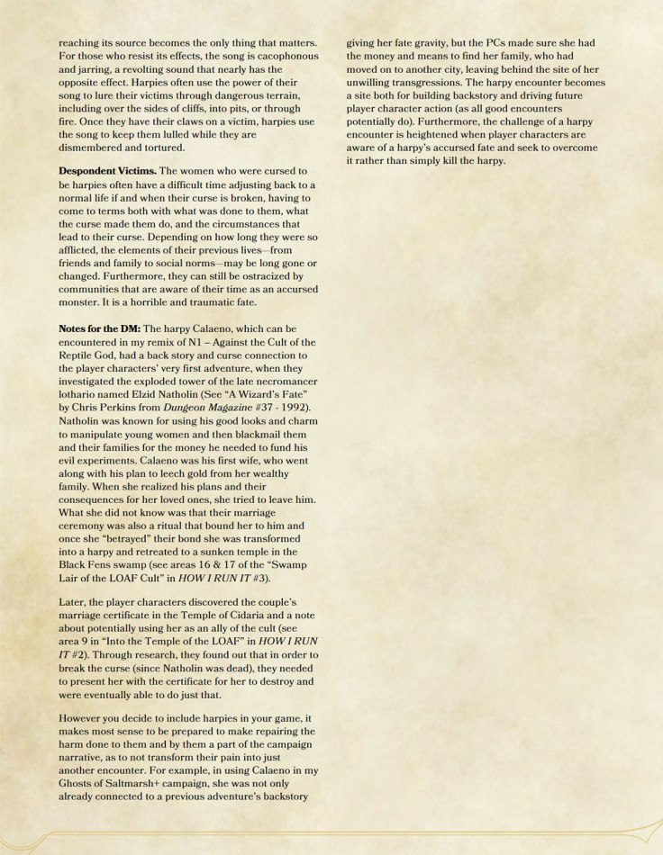 When writing the notes for my remix of N1 – Assault of the Reptile God, I found the inclusion of a harpy in the swamp lair troubling. Older D&D adventures have a penchant for putting monsters in close proximity without bothering to explain how or why that monster came to be there or why it’d cooperate with other monsters in the vicinity. (They will, however, explain if monsters are explicitly hostile towards each other). It was not just that I had trouble reconciling the monstrous and not very intelligent harpy coming under the sway of the naga, but that the very figure of the harpy was problematic. While they have their origin most notably in Greek Mythology, and other ancient cultural legends, harpies are also metaphorical stand-ins for the what I’d call a misogynistic view of women’s qualities. To simply have this race of monster-women that eat carrion and lure men to their deaths as just another thing to fight didn’t sit right to me.