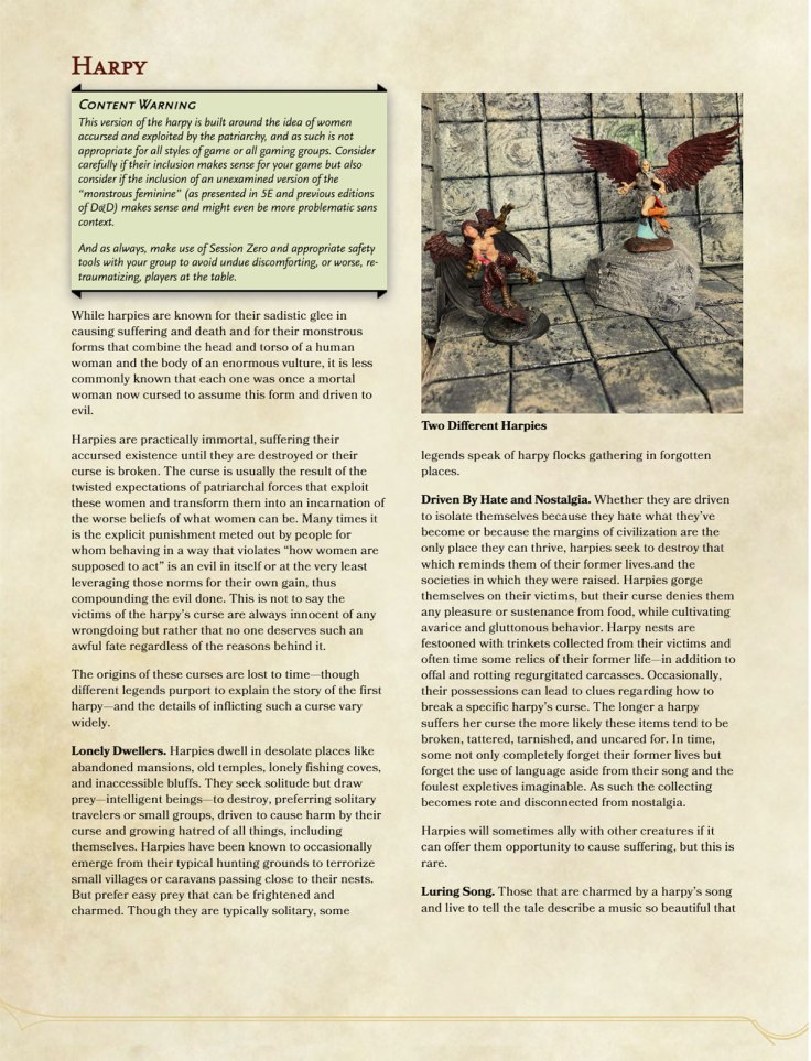 Rather than make “harpy” a generic monstrous species, I decided instead that they’d be the victims of a specific curse aimed at women. A curse that could be broken, not simply by a Remove Curse spell (I find that too easy and too boring), but by the completion of a ritual or ritualistic (and thus allegorical) actions involving specific objects and/or people. These women-turned-harpies are actually the targets of misogynist violence in the form of this curse. I see them as women who are cursed by patriarchal forces for violating some social norm related to their gender. The curse turns them into a physical manifestation of what the dealer of the curse imagines such women to be.