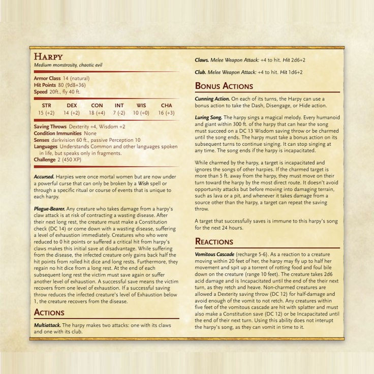 When creating a stat block for the harpy (and the one presented here is closer to what I ran than what I printed in HOW I RUN IT #3: Swamp Lair of the LOAF Cult), I wanted to make sure she was tough when encountered as a lone monster. I wanted the Luring Song to be tougher. I am not a huge fan of the ubiquity of the “save at the end of every one of your turns” thing in 5E. I prefer reinforcing the need for the player’s to act to force the additional saves to break the effect. However, if your group of PCs is so unlucky as to have the entire party fail their saves against the Luring Song, I’d allow new saves when they witness the first of their band start to get torn apart.