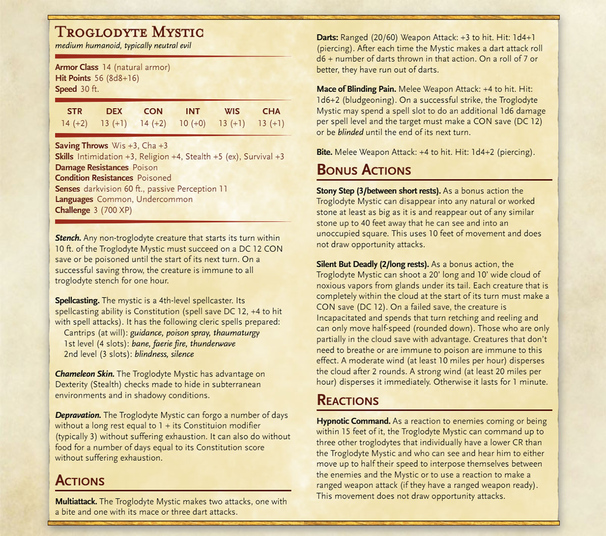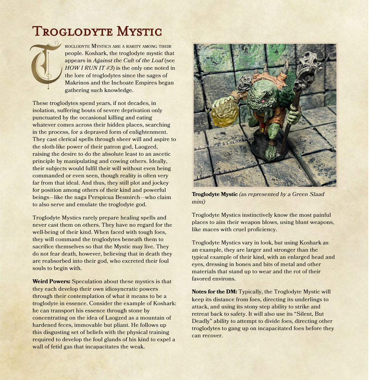 I didn’t want to use “priest” because despite being fine with that title as a generic, it implies a certain amount of organized religious practice that did not seem right for trogs. Maybe I should have stuck with “cult leader” as the name. Instead, I went with “mystic,” seeing these examples of troglodytedom as a kind of evil ascetic who has achieved a form of enlightenment through self-depravation and the exploitation of others. I think of them as a monstrous Keith Raniere type (well, fantastically monstrous, instead of actually monstrous). Living the life of a know-it-all guru and vanguard of a group of people is possible when you live on the backs of those people and gain power over and through them.