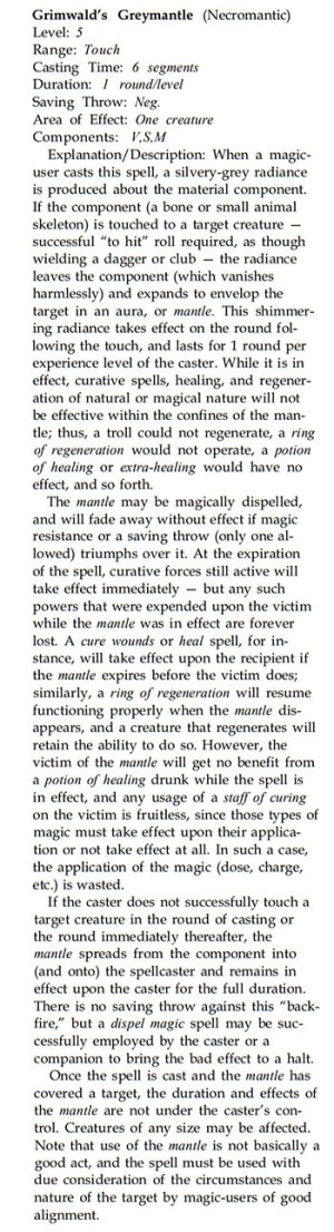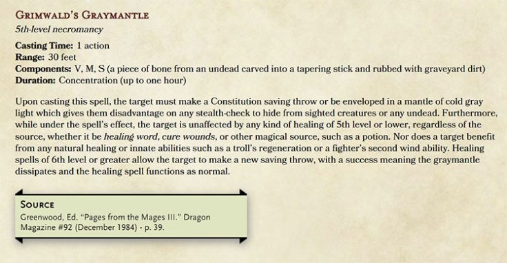 In order to bring the spell in line with the structure of 5E magic, I made the spell’s duration concentration, but unlike many 5E spells I did not want to allow the target an additional saving throw at the end of every round. I wish there was a lot less of that in 5E and where I can, I have gotten rid of it. It just makes throwing off a spell way too easy. You are bound to do so sooner rather than later. What fun is that? Instead, I added the mechanism where healing spells of a higher level than Grimwald’s Graymantle allow for another saving throw. At the same time, I have a hard time imaging someone potentially blowing a 6th or higher level slot to get rid of the mantle, but I think magic should come with a price.