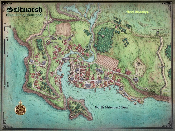 Alston finds Eliander working in his garden, shirt off and sweat glistening on his broad chest and well-muscled arms. He had curly rings of thick black hair. As he looks up to see the gnome approaching, so stands wiping his hands off on his pants and then reaching for a cane that leans against a fence post. He steps forward clearly suffering a permanent injury that stiffens his left leg. The bailiff greets Alston in gnomish. It turns out he learned several languages during his time in the army (which army he does not say), rattling off a few phrases in dwarven, elvish and goblin to impress his visitor. It is a productive talk. Eliander explains that Saltmarsh used to be a much more lawless place but that since his arrival and the relatively recent election of Anders Solmor as town Prefect, they have worked to together to keep things in line and make the town more prosperous for all. Sure, some of the locals are not happy that dwarves opened a new mine in the area and are using the town as a staging ground for shipping their resources out to other places in Makrinos and beyond, but it is giving the local economy a much needed injection of capital and that the First Minister (executive officer of the Republic) is finally paying attention to the area. Sure, there are occasional smugglers that he arrests and sends on to the capital for justice, but nothing too bad and not for some time.