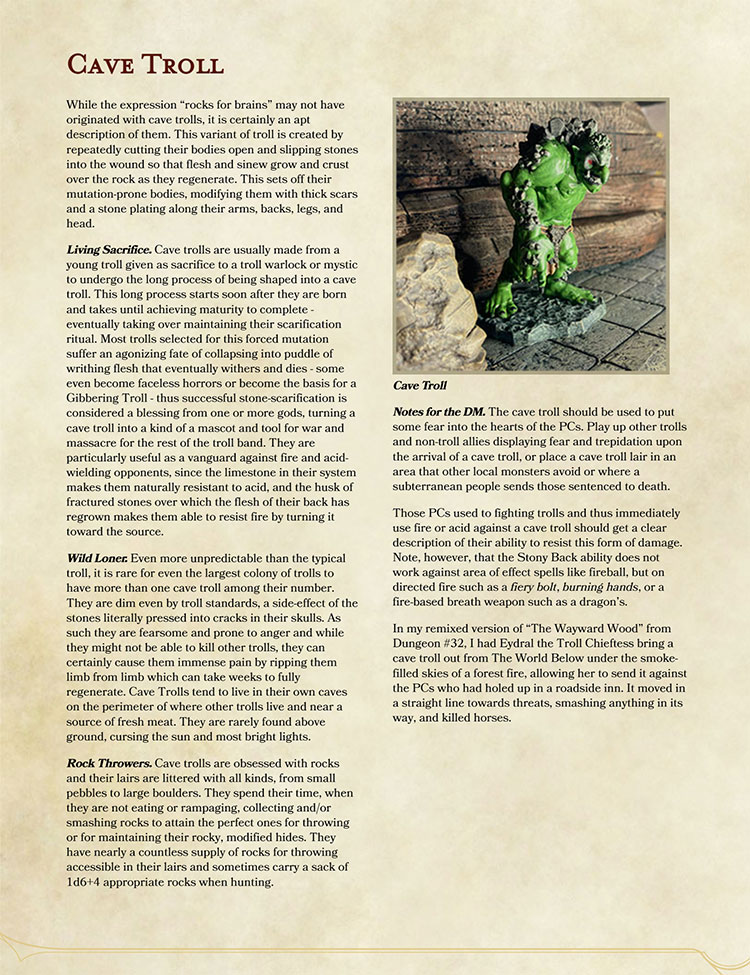 The vision of a troll whose body has been purposefully modified to make take advantage of trolls’ penchant for mutation and thus resist the two great fears of all trolls (fire and acid) is one that delighted me. So did the idea that this process makes them more aggressive and not as smart, as they have literal rocks in their heads. I see the cave trolls as the kind of monster that gets rolled into a big encounter that makes the players at the table say “OH SHIT!” when they try the usual tactics against it and find them not as effective. Furthermore, their high AC makes them a tough target just for whittling down.