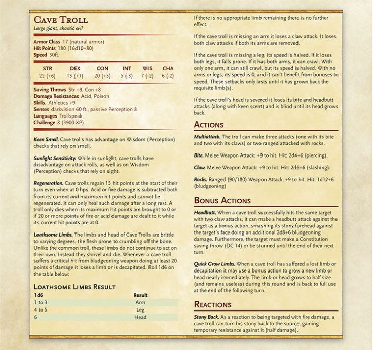 Lastly, in going over its stat block one last time, a friend mentioned it being weird that it was prone to being dismembered like a common troll, despite appearing thicker and having a stony shell. I realized he was right, so I decided to switch things up and make the crits that make it lose limbs (or a head) not be from slashing weapons, but from bludgeoning! This makes cave troll different from what is expected in a different way and can make a fight with one all the more interesting.