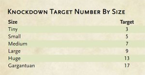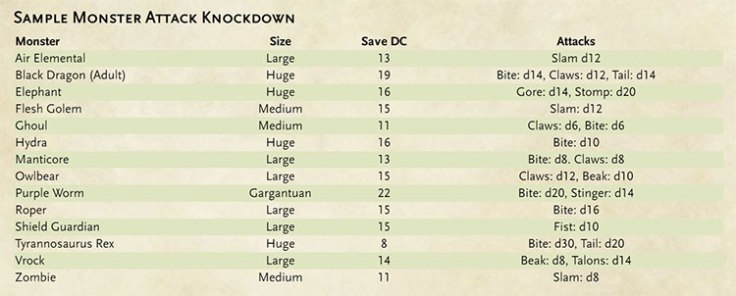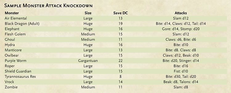 When it comes to monster attacks, the DM should make a ruling as to what knockdown die makes most sense using the guideline below. Of course, when monsters use weapons simply use the knockdown die of the weapon they are using but when relevant, modify it by size (see below).