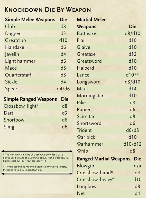 There are a few weapons that are exceptions. Weapons that use two dice for damage (like the maul’s 2d6) should use a die equal to the maximum possible damage (in this case d12) as the base which is then modified by the type of damage it deals (thus, the maul goes up to a d14 knockdown die). The knockdown die of versatile weapons is different when used one- or two-handed.