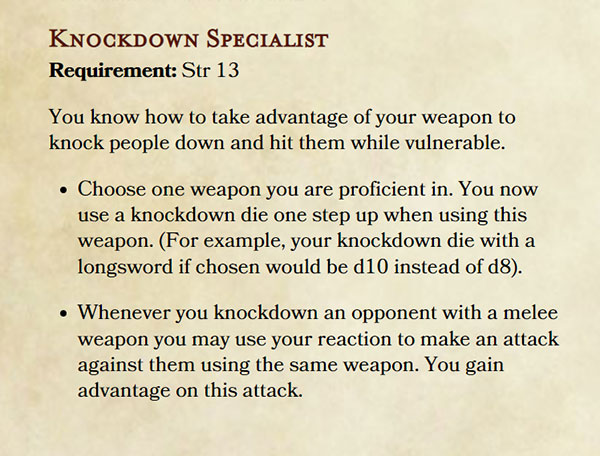 Finally, below is a feat that could be useful for a build that wants to focus on Knockdown. Originally, this was two different feats, but since 5E feats seem to be across-the-board more powerful than feats in 3.xE I decided to combine them into Knockdown Specialist.