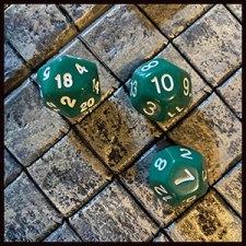 Rastfar’s dice (clockwise from the left). A d20 for the attack roll, a d14 for the knockdown chance, and a d12 for damage.
