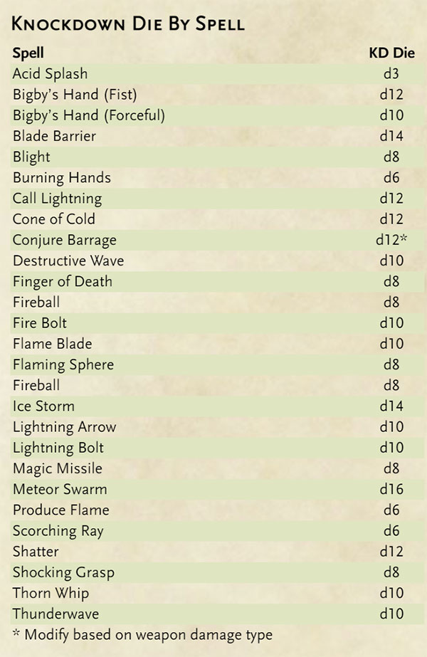 Figuring out the knockdown die for spells uses the same basic guideline as weapons and monster attacks. The knockdown for spells is based on damage die and then adjusted based on the damage type. Furthermore, the die type is raised an additional step for every 5 full damage dice. Spells that already have a chance to knock targets prone should not get an additional knockdown chance. When determining the DC against being knocked down, use the spell caster’s ability score modifier in place of Strength.