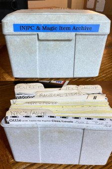 Fourteen-year-old me took this advice to heart. I had a green metal file box for three-by-five cards and inside I put tons of NPCs I’d make when I should have been doing my homework. Later, I’d graduate to four-by-six cards, and I still have the file box I used for those. It is the same box that holds the cards I make (and hand out) that represent magical items.