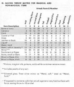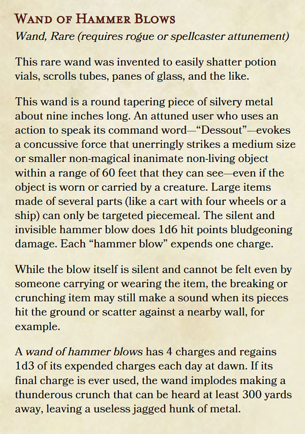 The wand breaks small mundane items like potion vials and crystal vases. As written, the wand is meant to almost always destroy fragile items, like those made of glass. According to the original version, meant for AD&D 1E, the target of the wand has to make an item saving throw against “crushing blow” or be broken. Well, D&D doesn’t have “item saving throws” anymore. Objects have armor classes and hit points based on their size and whether they are categorized as either fragile or resilient. Well, since the original wand struck unerringly, I kept with that ability, but instead of a saving throw, I made it do enough damage to inanimate non-magical non-living objects to be counted on to usually break glass or crystal. Back in the day, a potion vial making a save versus crushing blow had to roll a 19 or better to make the save, making the new version’s damage a 1d6 means that the wand has a decent chance to break most fragile items. Even the thickest glass potion vial only has 4 hit points, while the least resilient metal flask only has 2, but could have as much as 8.