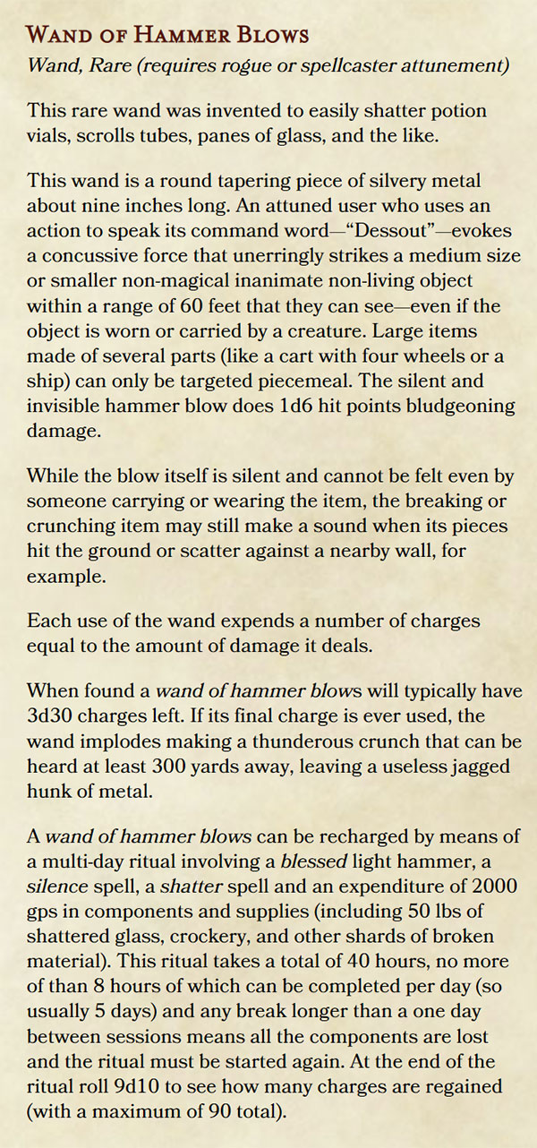 I am not sure why the fantasy of the wand of hammer blows appeals to me so much, but I like the idea of some rogue or shady wizard using the wand to break a lock, smash a lantern, crack open manacles. I can also see it being useful against some weapons like bows or daggers, damaging them beyond use.