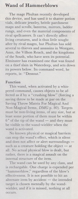 Of the wands detailed in Ed Greenwood’s “Nine Wands of Wonder” article in Dragon Magazine #102, the only one that really interested me was the Wand of Hammer Blows. It might be simple and mundane but it struck me as a useful magical tool in depriving others of some object.