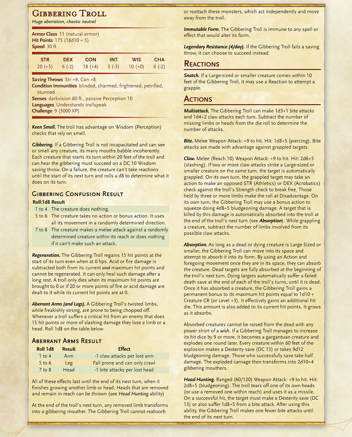 As for its chopped off limbs turning into Gibbering Mouthers, I am not sure where the heck that came from. I guess, I was just trying to think of some variations of what happens when a troll has an arm or leg chopped off. And since this abomination has significantly more limbs to chop than the common troll, I liked the idea of them turning into mind-bending mutant monsters as the troll itself simply grows new ones. And then like the Blob, it absorbs what it kills and becomes bigger.