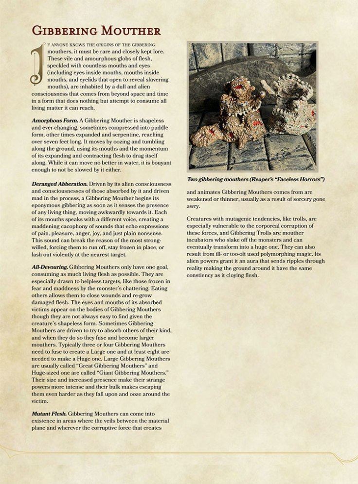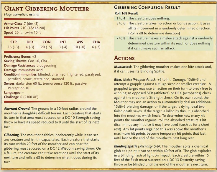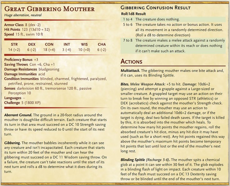 n.b. Welcome to Troglodyte Tuesday! A feature in which I present (or re-present) monsters I have created or adapted for use in my own 5E D&D campaigns, including lore, tips for running them, and a stat block. Today we have my own version of the Gibbering Mouther.