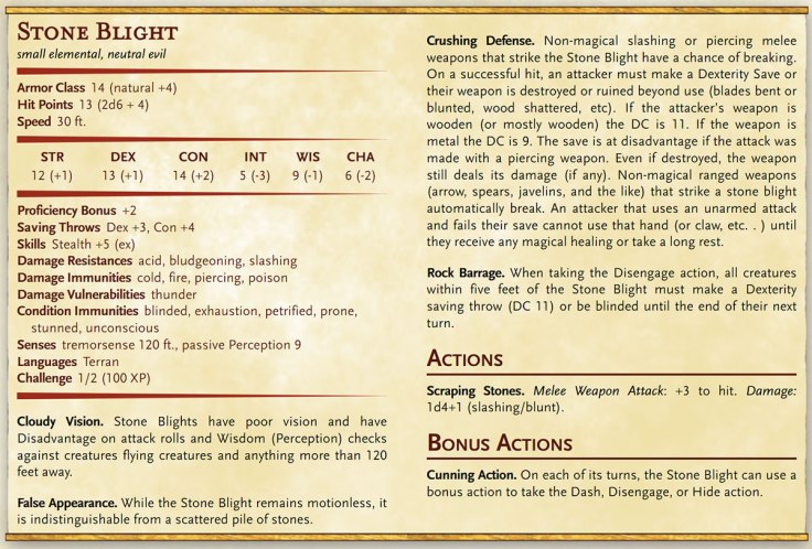 Finally, the various immunities and defenses of the Stone Blight make it something of a trial-and-error puzzle for the neophyte adventurers that would be facing them. I think having the kind of monster that requires a little bit of “figuring out” in order to most efficiently defeat it is especially important at low levels and for newer players, in order to reinforce at the purely mechanical level that simply trying to hit it with whatever weapon you happen to have may not always be the best option. And from a flavor perspective, being able to describe the weapons being smashed, how ineffectual fire spells are, or how the monk’s stunning strike not only has no effect, but leaves their hand swollen and bruised in the process(!), also helps reinforce that combat is about more than trading blows.