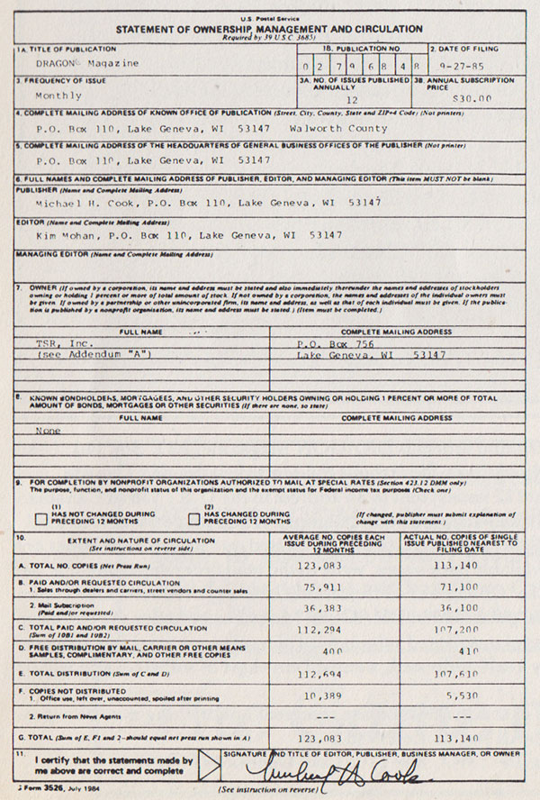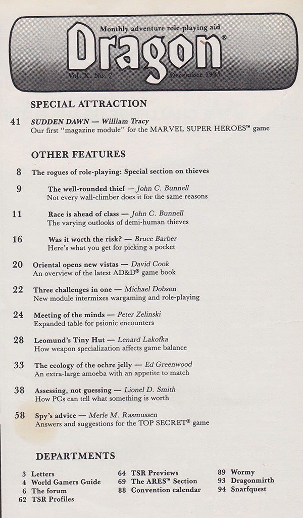 The cover copy promises a 16-page module for the MARVEL SUPERHEROES RPG, a spotlight on thieves (and there are three articles on the topic) and another in the series of “Ecology of…” articles. But before getting to any of that, the thing that stuck out to me most immediately upon opening up the issue after a few intervening decades, was the Statement of Ownership, in which magazine publishers fulfilled their legal obligation to print their circulation numbers on a yearly basis. According to this document’s reproduction, Dragon Magazine printed an average of 123,083 copies of each monthly issue. Nearly 76k of these were circulated through shops, while around 36k were subscription issues. These seem like pretty good numbers for such a niche periodical, though to be honest the only point of comparison I have are comic books, which I studied quite a bit for my PhD dissertation and for my former blog of comics scholarship The Middle Spaces. Ultimately, I don’t have the expertise in either RPGs or periodicals to put these numbers into context, but I like having them anyway.