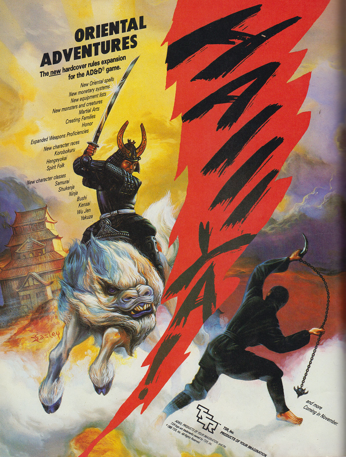 Aside from giving an overview of the new classes and “races” (like the shape-changing hengeyokai, the dwarf-like korobokuru, and hybrid spirit folk), Cook explains in part the new rules for “non-weapon proficiencies” (something we’d see more of in the Wilderness Survival Guide and Dungeoneer’s Survival Guide and eventually as a standard part of 2E). He also says that “the oriental character would be incomplete without a family clan and history.” This notion along with the system of “Honor” the game establishes exoticizes the kinds of familial and community connections and resultant values that exist in any culture by describing it as a rigid system placed into a numeric framework while simultaneously homogenizing all the various distinctions among the cultures of Asia. As the Cool History Bro YouTube video on “Honor” explains, “There is no such thing as an all-encompassing moral value called ‘Honor’ in Asia. This is just a gross simplification of all the different values and philosophies of these various cultures condensed into an absurd catchphrase.”