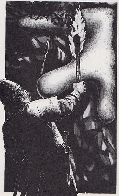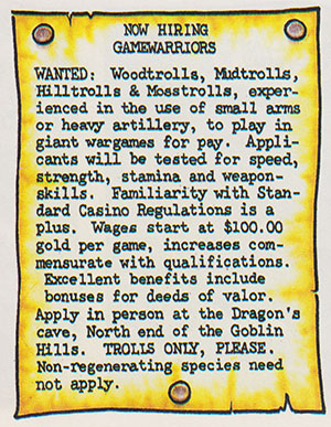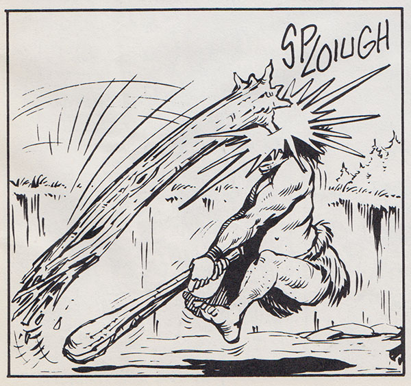 As usual, the issue ends with comics. Wormy opens with a beautiful full-page splash of a troll village up in a tree and the titular dragon’s imp servant putting up a sign calling for trolls to play in his war games. SnarfQuest has a still-addled Snarf going head-to-head with the mountain giant that walloped him and this time defeating him through sheer dumb luck. SPLOIUGH! Snarf is the fool-hero and I continue to really appreciate Larry Elmore’s cartooning. This issue’s installment also features the first appearance of Telerie Windyarm, the sexy woman warrior who is impressed with Snarf’s “prowess” and will eventually become his love interest. She invites him to join her on an adventure to seek the treasure beyond the trail the giant guarded.