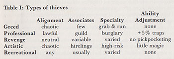 Dragon Magazine #104’s Spotlight on Thieves consists of three articles, two of which are by John C. Bunnell. The first, “The Well-Rounded Thief” attempts to fill out and develop the class that at that time—before they were called “rogues”—were seen as shifty types who could not be trusted, even by their own party members. It provides different possible motivations for thief characters, and while I think this kind of article was important to breaking that class out of the narrow box in which it mostly existed, the article also unfortunately makes some strange assumptions of its own about those different motivations that are narrow in their own way. For example, among the different motivations suggested—professional, revenge, artistic, and recreational—is the greed motivation, and for some reason thieves with this motivation tend towards “grab and run” tactics and “generally avoid sophisticated burglaries.” But why? There is no reason why a greedy thief might not go for the big score over the smash and grab. Furthermore, Bunnell writes that these thieves are “more likely to employ poison.” Again, I have to ask why? While I can imagine reasons, the article does not do anything to explain but takes the categorical obsessions of D&D as a given framework for playing characters. Like I said, I think this article can be useful for inspiring the kind of rogue you want to play but taken as framed it is still holding people back.