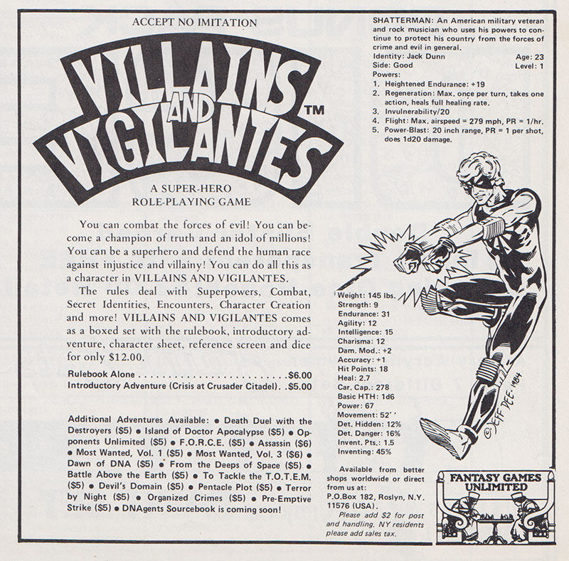 John Maxstadt’s letter is spread out over three pages scattered throughout the magazine (it is an odd, but I am assuming necessary, layout choice), and the central page also holds an ad for Villains & Vigilantes. As I mentioned in my discussion of Dragon #92, these ads included the stats for a hero or villain for use in the superhero game. The one for Kali I mentioned earlier has appeared in every issue I have covered so far (though I didn’t think its repetition beared mentioning until now) but this issue’s ad presents Shatterman, a military vet and a rock musician who uses his sonic powers to “continue to protect his country from the forces of crime and evil in general.” He has flight, endurance, and a power blast.