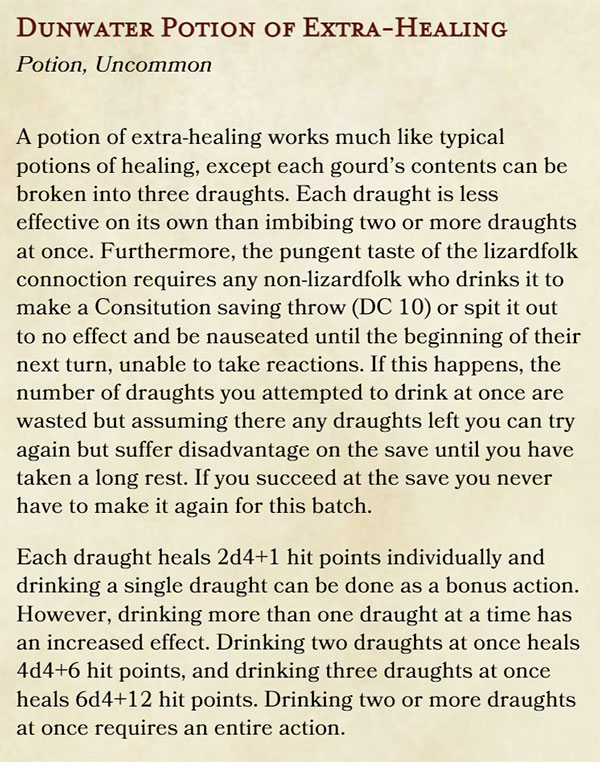 Lastly, since this version of the potion of extra-healing was brewed by lizardfolk I decided to add a potential obstacle to its use. The herbs and other ingredients used by the lizardfolk are foul and quasi-purgative to non-lizardfolk. As such, if a non-lizardfolk drinks it they must make a Constitution saving throw (DC 10) to gulp it down, or else they spit it up, lose the draught(s) they were trying to drink, and are nauseated until the beginning of their next turn and unable to use reactions. The DM may rule that certain other species also do not need to make such a save, being immune to the side effect.