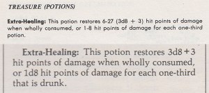 The potion of extra-healing is a magical item that existed in 1E and 2E AD&D but that did not appear in 3E when various items and effects were streamlined and made more consistent. It has not appeared in any edition since either. I reintroduced the item because while I understand the convenience of consistency, when it comes to magic I prefer a variety of possibilities and options. Not all items of a similar type need to work the same way and furthermore, items that require players to make a choice about how and when to best use them are more interesting to me.