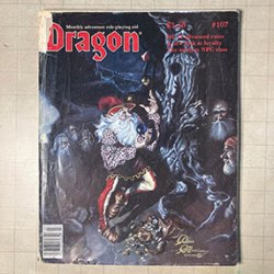 I can’t say that the cover of Dragon Magazine #107 (March 1986) inspires many memories of its contents or putting it to use. In fact, as I opened it up for the first time in two and a half decades (or longer), I was sure it would be a quick overview of stuff that didn’t mean much to me then or now. Yet, once I started perusing it, I realized there was a lot more in there that I had found useful back in 1986. It was just that the cover itself never lit a fire in my mind.