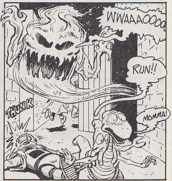 In Dave Trampier’s Wormy, the game-playing little tree trolls end up hunted by diabolic-looking ogres and in Larry Elmore’s Snarfquest, Snarf and friends are separated while fleeing a ghost.