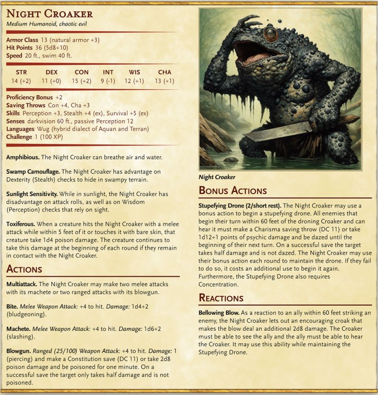 You will only find three types of wugs below (as compared to six in Flee, Mortals!) and one of them—the Wug Gang Leader—is basically just a stronger wug with more hit dice. The Night Croaker is a kind of nocturnal wug bard with more of a toad-ish look. I would recommend tweaking the Angulotl Slink as a fourth kind of wug, though in terms of the niche I think wugs should fill (for low level encounters), I think Slinks have way too many hit dice. In my mind, a creature that is good at hiding and attacking from stealth should have fewer hit points, since actually getting to attack it is a challenge in itself. I’d give them 3d8 (between the Wug Grunt and the Gang Leader). That said, for some reason Angulotl’s have d6 hit dice despite being medium creatures, and I could find no explanation for this in the book (though not having read it cover-to-cover, I will admit I might have missed it).