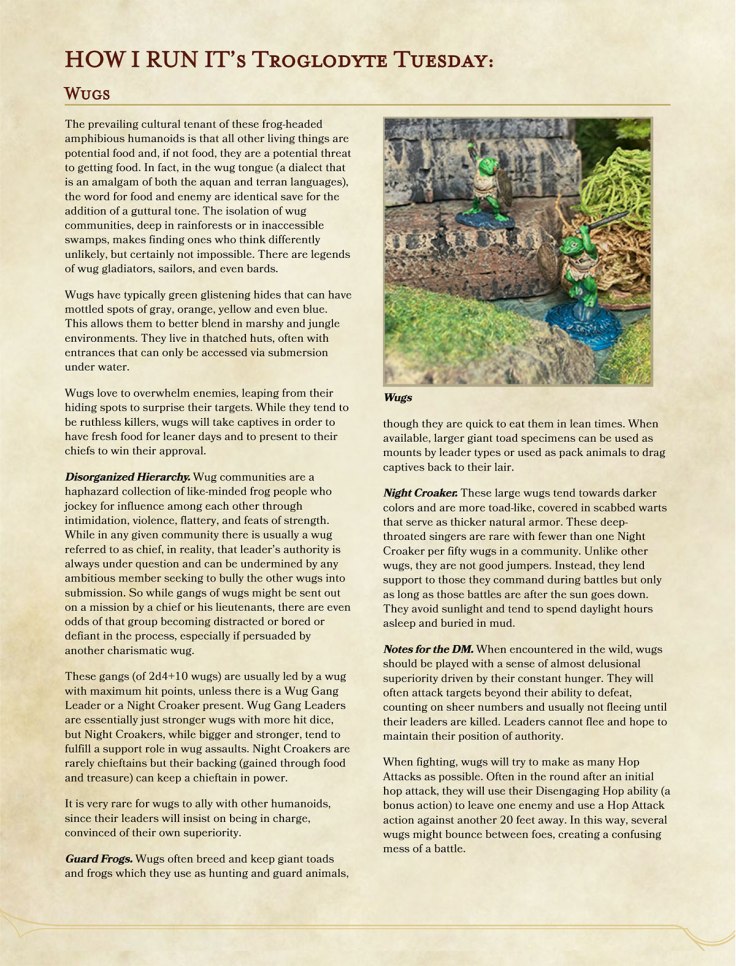 I used them and referred to them so frequently that at my table it was not uncommon to simply shorten their name to “wugs,” and I’d often have NPCs refer to them as such. Because of this, I have decided to call the version described here “wugs” as well (since technically “bullywugs” are not part of the 5E SRD or in the Creative Commons).