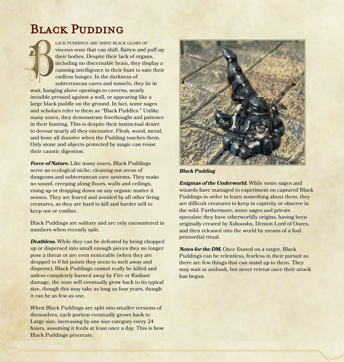The description of the Black Pudding in the AD&D 1E Monster Manual starts off with a interesting description of its composition (in the mix of medieval bestiary and anachronistic pseudo-science common to Gygaxian writing), calling it “a monster composed of groups of single cells.” This sentence alone led me to the “Deathless” ability I gave the pudding. In other words, unless killed in a specific way (fire or radiant damage), the Black Pudding will eventually grow back to full size. Now, this won’t matter in the vast majority of cases, since it takes 1d4 years to regrow, but in terms of the world-building aspect of monster creation, it is the kind of thing that might explain (for example) why there is still a black pudding in some dungeon cleared out previously by adventurers some years ago. Or it might inspire a DM to create a stat block for a Tiny or Small sized Black Pudding (something the AD&D version includes in its descriptive text). Or be a required component of some spell or in some magical item creation that grants regeneration or longevity.