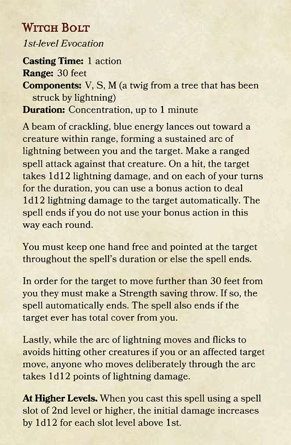 I think it is fair to say that Witch Bolt is not a great spell. Sure, the description of it—“A beam of crackling, blue energy lances out toward a creature within range, forming a sustained arc of lightning between you and the target”—makes it seem cool as heck, and who doesn’t like to roll that rarest of D&D dice, the d12? But the spell’s requirement that the caster use up an action each turn to do additional damage and the waste of its visual effect in terms of having no mechanical function whatsoever is a clear weak point in its design. I don’t know of anyone who thinks it is a good spell.