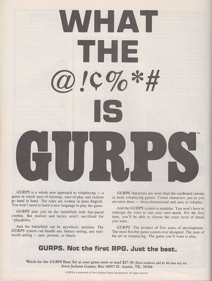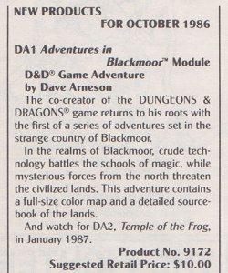 Taking a pause from talking about articles for a moment, there are a few other items of note in this issue. There is the first ad I remember seeing for Steve Jackson Games’ GURPS (Generic Universal Role-Playing System). There is also a two-page spread advertising the DC Heroes RPG, a game I would not have tried in 1986 (being a “Make Mine Marvel/DC Sucks!” kid at the time), but that I did eventually get to try a few times about 10 years later. The TSR Previews spread includes a bit about the then forthcoming DA1 – Adventures in Blackmoor, which surprised me given that I thought by the mid-80s Dave Arneson had as little to do with TSR and D&D as possible save for his royalties and occasional visits for stockholder meetings. A little internet sleuthing, however, has brought to my attention that there was a brief time (about a year?) when Arneson—co-creator of Dungeons & Dragons—was brought back into the fold for the DA series.