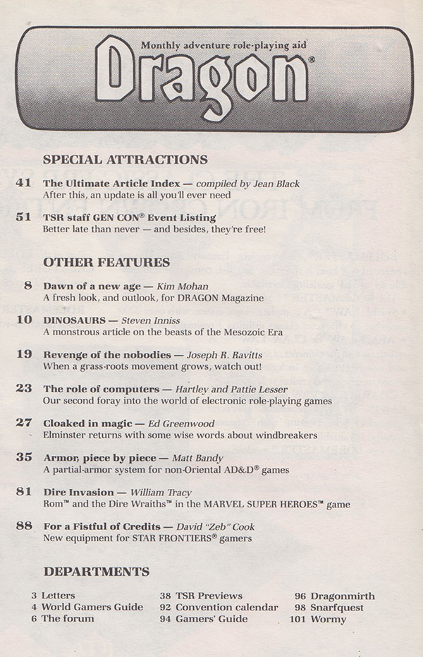 Another reason why the issue is kind of unmemorable is that there is not much in there worth remembering. Most of the issue is taken up by an unreasonably long (you might say “padded”) article re-doing dinosaurs for AD&D and giving some suggestions on building encounters with them and introducing them to your setting, and by “The Ultimate Article Index,” going back as far as Dragon #1, but not including issues of its predecessor, The Strategic Review. The dinosaur article takes up 18 pages. The index is spread across 19 pages. That is 37 pages of a 104-page magazine. In other words, too much.