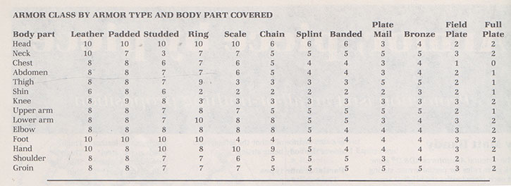 Of course, despite the slog it’d make of combat, I tried to implement this system in my games but dropped it fairly quickly. It was just too much to deal with for every potential hit. Later, in my 2E games (and ported into my 3E games), my groups did use weapon vs. armor type rules, giving each basic armor type three armor classes versus slashing, piercing, or bludgeoning weapons. We played with those rules until 2016.