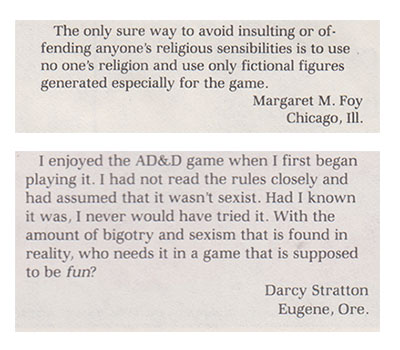 Margaret M. Foy (who would go on to pen one of my all-time favorite Dragon articles just a few issues from now) writes in to argue that using real world pantheons of gods for D&D is disrespectful, especially for so-called “pagan” religions. She specifically points out examples included in Deities & Demigods (retitled Legends & Lore) like the inclusion of Hindu and Native American gods, but does not limit it to these, saying that there are still adherents to Celtic, Nordic, and African gods and religious customs which have found their way into the game. She goes on to say that “[s]ince TSR’s products are so popular among children and young people…it is especially important that these products not endorse or tolerate religious intolerance.” She ends her letter by writing, “The only sure way to avoid insulting…anyone’s religious sensibilities is to use no one’s religion and use only fictional [divine] figures generated especially for the game.”