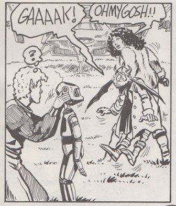 The issue finishes off with the usual comics. The one-panel DragonMirth strips are not worth mentioning, but in Larry Elmore’s SnarfQuest (strip #37), Snarf and company have a close encounter with a visitor from the same futuristic alien world as Aveeare the Robot (pronounced “A.V.R.”), who has recently arrived on a spaceship. When the visitor shuts down Aveeare for maintenance (I guess), Snarf and Telerie, who don’t know their companion is a robot—let alone what a robot even is—assume their friend has been killed! As revenge, they knock the guy out and tie him to a gagglezoomer. What is a gagglezoomer? Well, the editorial note tells you to check out SnarfQuest #17 for details. But when Aveeare wakes up, boy, are his friends embarrassed! No one is gonna see that pointy-eared alien dude again.