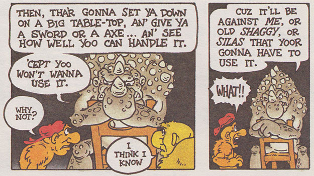 In Dave Trampier’s Wormy, some tree trolls (remember, they are only a few inches tall) find themselves prisoners of ogres who plan to sell them to giants for use in wargaming, which is barely better than their original assumption that they were going to be eaten.