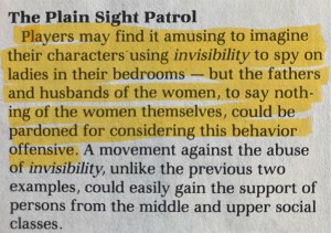 This last one really stuck out to me because of the context given for it. Ravitts writes, “Players may find it amusing to imagine their characters using invisibility to spy on ladies in their bedrooms—but the fathers and husbands, to say nothing of the women themselves, could be pardoned for considering this behavior offensive.”