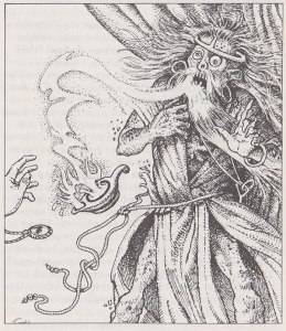 Barber suggests that his take on this plane is suitable for characters of 10th level or higher to explore. The article includes a small encounter table that ranges from as simple as a lowly ettercap (what the heck it is doing wandering around Hell?) or a stench cow, to a random devil or demon that could be of any power level. It provides details on crossing the River Styx, an interplanar barrier that must be crossed to actually reach Hades (and that has inspired me to include a version of in the cosmology of my current setting), the politics of the place, a Who’s Who of the tortured occupants like Sisyphus and Tantalus, stat blocks for Persephone and Orpheus (but no one else for some reason), and a very long list of spell alterations. For example, if a cleric were to try to cast Aid while in Hades, the recipient suffers the effect of a curse and takes 1d8 hit points of damage!